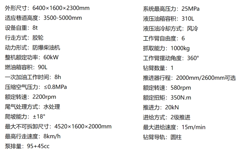 防爆柴油機(jī)多功能管路安裝鉆車(膠輪式)是我院經(jīng)過長期調(diào)研,專門針對煤礦井下管路安裝工藝開發(fā)的一款新型產(chǎn)品,解決了傳統(tǒng)人工安裝方式中存在的勞動強(qiáng)度大、安裝效率低、安全隱患高的問題,在設(shè)計此款產(chǎn)品時還考慮到井下其他輔助工作存在的一些難點,并將其解決方案設(shè)計在了此款防爆柴油機(jī)多功能管路安裝鉆車上,在能夠滿足管路安裝的前提條件下還可以實現(xiàn)煤礦井下管路/物料運輸,錨桿、錨索施工,巷道修復(fù),大塊破碎,U型梁輔助安裝等功能,實現(xiàn)一機(jī)多用,可節(jié)省井下空間、節(jié)約設(shè)備成本、減少尾氣排放、提高工作效率。