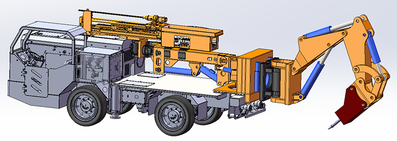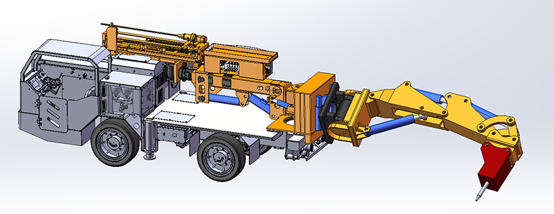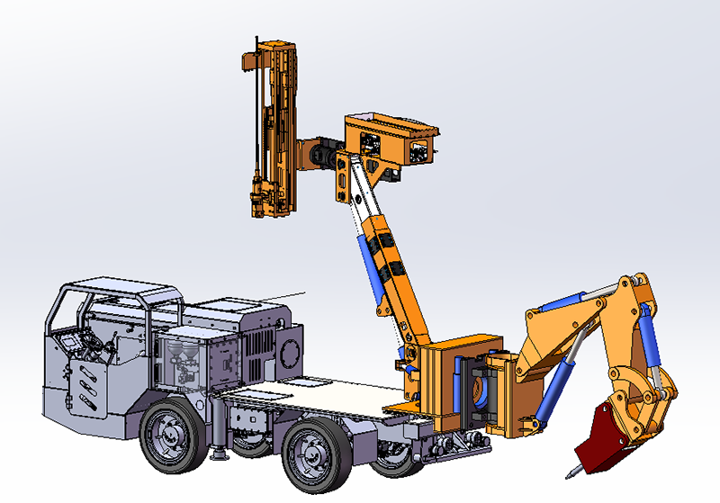 防爆柴油機(jī)多功能作業(yè)車(chē)是我院經(jīng)過(guò)長(zhǎng)期調(diào)研,專(zhuān)門(mén)針對(duì)煤礦井下多種作業(yè)方式開(kāi)發(fā)的一款新型產(chǎn)品,為客戶(hù)解決了傳統(tǒng)人工安裝方式中存在的勞動(dòng)強(qiáng)度大、安裝效率低、安全隱患高的問(wèn)題,我院在設(shè)計(jì)此款產(chǎn)品時(shí)還考慮到井下其他輔助工作存在的一些難點(diǎn),并將其解決方案設(shè)計(jì)在了此款防爆柴油機(jī)多功能作業(yè)車(chē)上,在能夠滿(mǎn)足管路安裝的前提條件下還可以實(shí)現(xiàn)煤礦井下錨桿、錨索施工,巷道修復(fù),大塊破碎等功能,實(shí)現(xiàn)一機(jī)多用,可節(jié)省井下空間、節(jié)約設(shè)備成本、減少尾氣排放、提高工作效率。