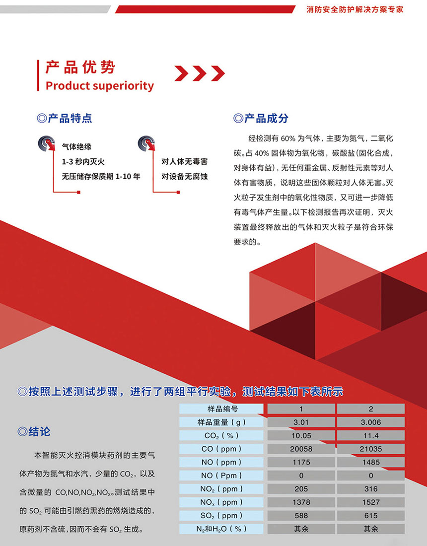 物理合成化學(xué)固化制劑滅火裝置經(jīng)檢測(cè)有60%為氣體,主要為氮?dú)?,二氧化碳。?40% 固體物為氧化物,碳酸鹽(固化合成,對(duì)身體有益),無(wú)任何重金屬、反射性元素等對(duì)人體有害物質(zhì),說(shuō)明這些固體顆粒對(duì)人體無(wú)害。滅火粒子發(fā)生劑中的氧化性物質(zhì),又可進(jìn)一步降低有毒氣體產(chǎn)生量。以下檢測(cè)報(bào)告再次證明,滅火裝置最終釋放出的氣體和滅火粒子是符合環(huán)保要求的。